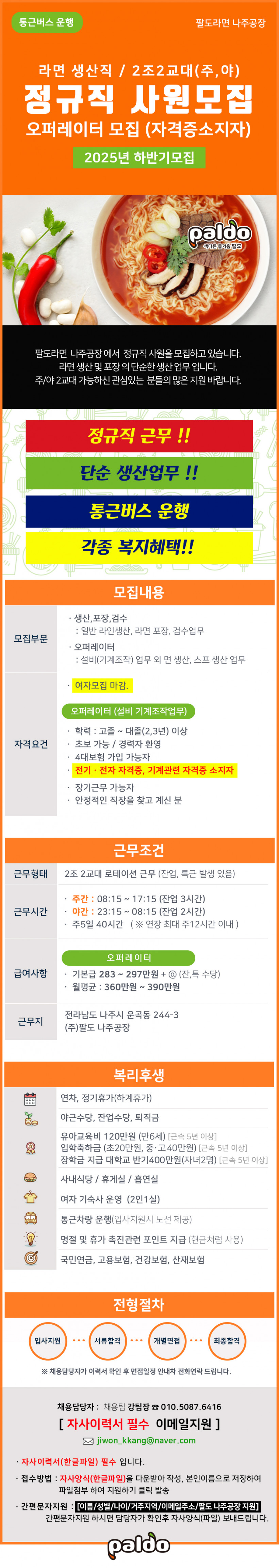 팔도 나주공장 오퍼레이터모집(자격증소지자) 20251127 이전글 다음글 목록 본문 팔도 나주공장 오퍼레이터모집(자격증소지자) 20251127 댓글목록 등록된 댓글이 없습니다. 이전글 다음글 목록
