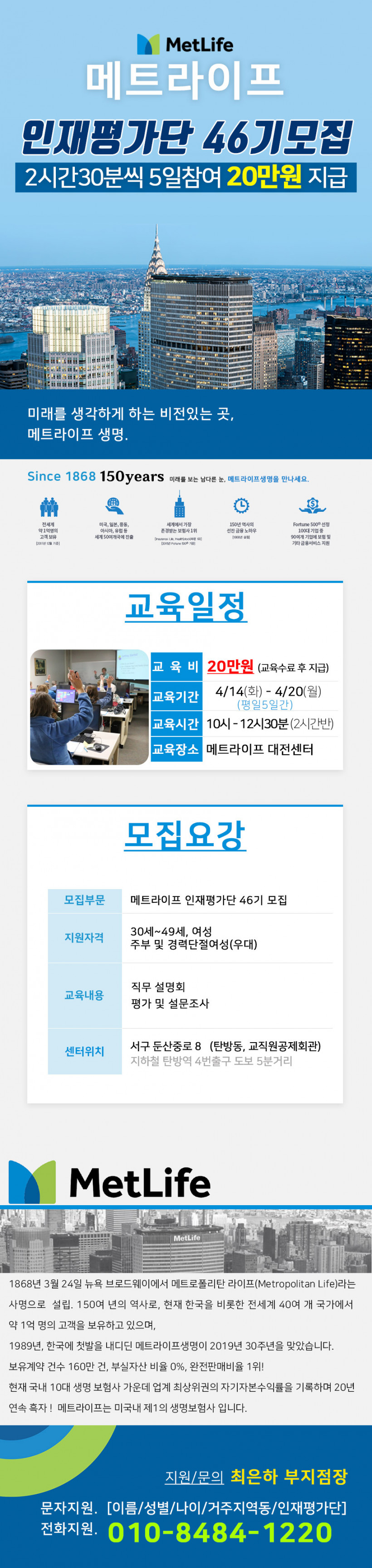 대전 메트라이프 인재평가단 46기 모집 2026.03.25 이전글 다음글 목록 본문 대전 메트라이프 인재평가단 46기 모집 2026.03.25 댓글목록 등록된 댓글이 없습니다. 이전글 다음글 목록